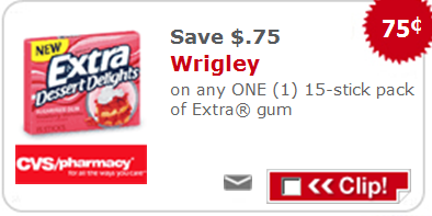 CVS.com has a great printable MANUFACTURER’s coupon good for $.75 off Wrigley Extra gum!   The best part is, it is  NOT a CVS coupon, but a manufacturer’s coupon that can be used at ANY store. If your store doubles coupons, you should be able to pick up FREE packs of gum with this coupon!
