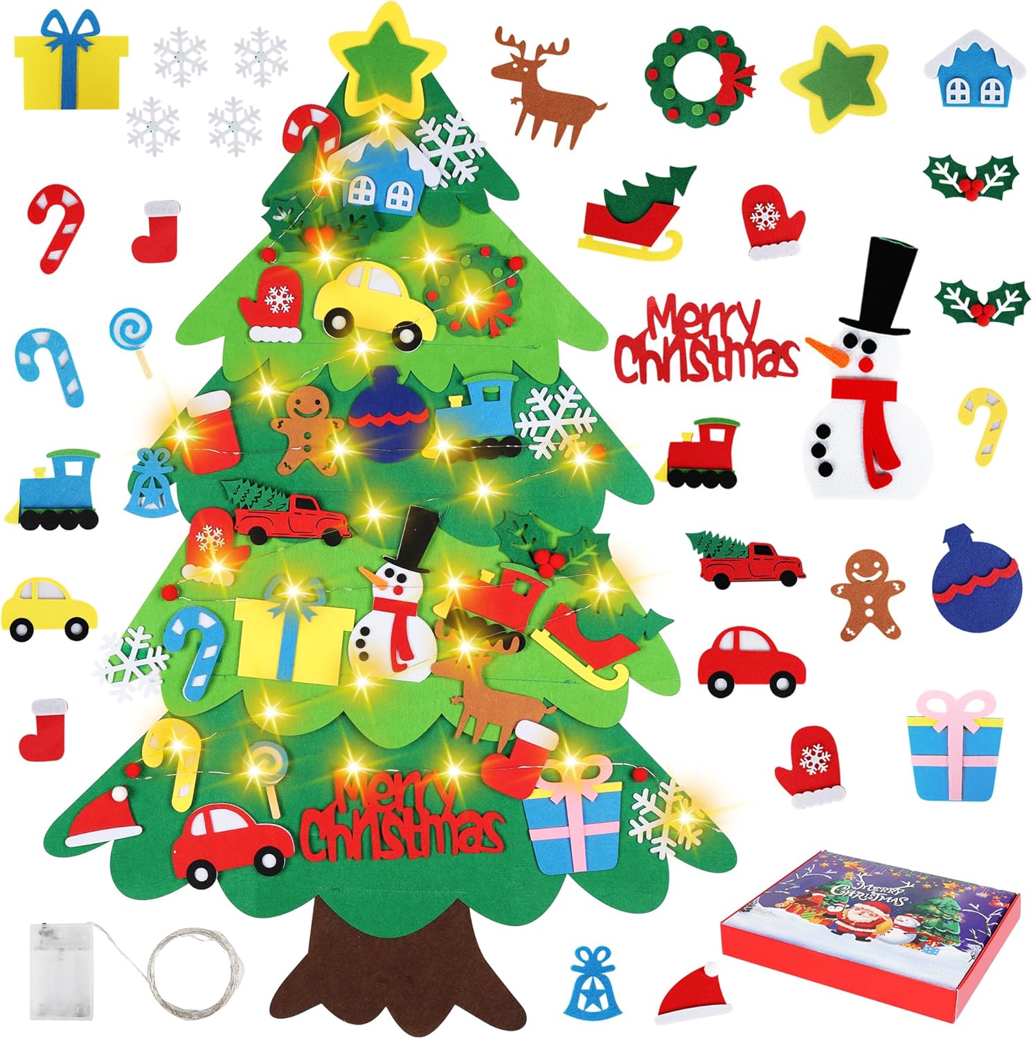 - 1. A Good Christmas Gift Set: Includes 1 set of felt Christmas tree (unfolded dimensions: 40 inches / 100 cm in length, 27 inches / 68 cm in width), 16 feet of string lights (battery not included), and 32 Christmas decorations: car, Santa Claus, snowman, snowflakes, Christmas stockings, Christmas hats, candies, bells, etc.