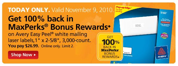 TODAY ONLY you can get FREE Avery Easy Peel White Mailing/Shipping Labels (3000 count). You will need pay spending money out of pocket (unless you’ve been rolling your rewards), then you will earn back 100% of the cost in the form of MaxPerks Rewards (ie., Office Max Gift cards) at the end of the quarter.