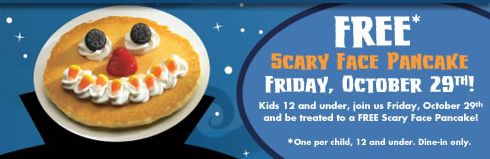 Looking for something fun to do with your little ones Halloween Weekend?  On October 29th, you can take your kids ages 12 and under, by IHOP for a FREE Scary Face Pancake!  Mark your calendars so you do not forget!