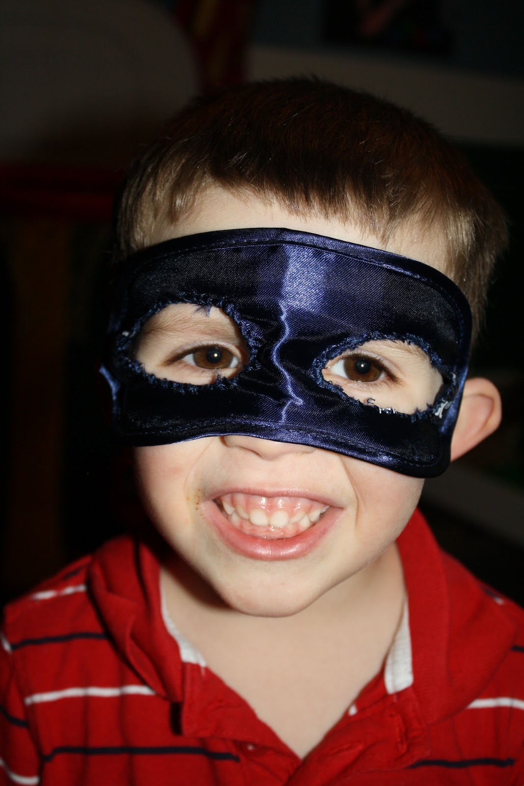 I posted about a Tylenol Sleep Kit (no longer available)not long ago. Well in it came a blue sleep mask. After opening the freebie, I left the sleep mask laying out. Hubby opened the package and held it up and exclaimed I have an idea! He quickly grabbed the scissors and started cutting 2 holes in the mask. Then I grabbed some thread and quickly did a stitch around the hole to stop frays. Now granted it was not the best cuts or sew job, but as you can see from below it didn’t matter! Instant Super Hero!!!