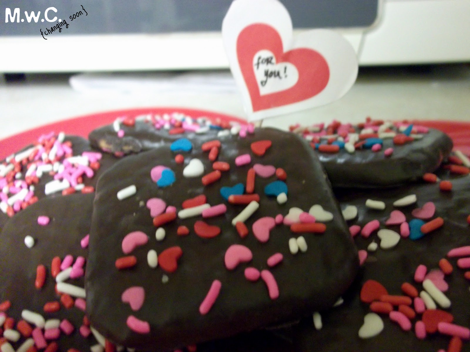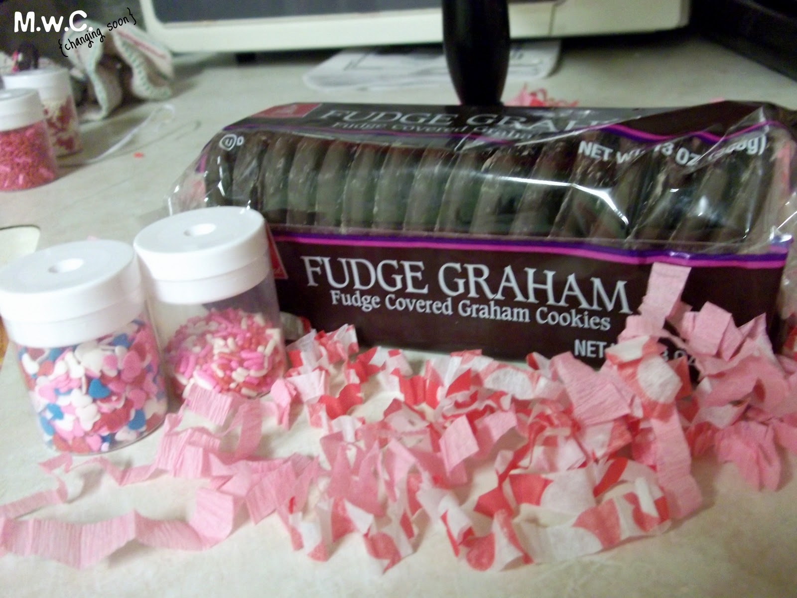 I was at dollar tree Saturday buying valentine’s balloons for my daughter’s nursery class, I began to browse while they blew up the balloons and I found some fudge covered graham cookies and I grabbed them for my son, he loves him some fudge covered grahams and I usuallly buy them at this one place 3for $1.25 so getting 16 for $1 was a steal. I decided to buy 4packages. I took my fudge covered grahams and balloons home. After the kids had gone to sleep, I started to make the cupcakes that I would bring to church for them to share with their classes. While the cupcakes baked I gathered all the supplies in a basket that I would need to take to church the next morning. My plan was to ice the cupcakes at church so when I went to grab the sprinkles to put in the basket I had one of those AHA! moments. I immediately pulled one of those graham cookies out of the pantry and soon that plain cookie was transformed into an amazing valentine treat. I took a bite to make sure it tasted alright [I was afraid I had messed up the flavor of the chocolate] but to my surprise it was delicious. So here is my quick tutorial/recipe for a super fast v-day treat your family will love, great for FHE or any other occassion.