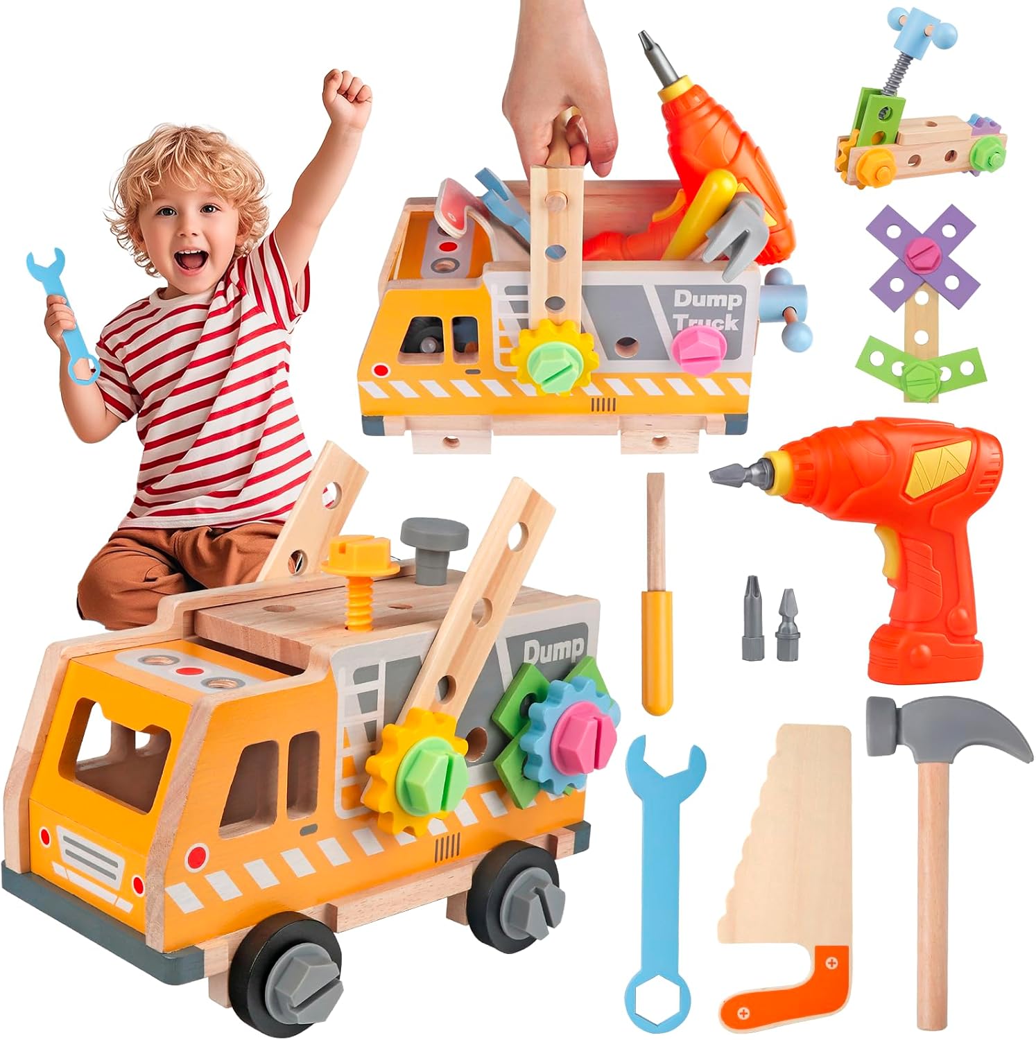 - ??3-in-1 Kids Toys Tool Set: Combines a toy truck, play table, and organized storage in a wooden truck bench, boys toddlers love driving the truck and using exterior holes for design exploration. Slide-open top compartment holds tools; detachable handle makes cleanup and travel easy.