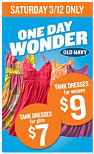 Saturday 3/12, Old Navy One Day Wonder Event thrifty deals like $9 Women’s and $7 Girls Tank Dresses.