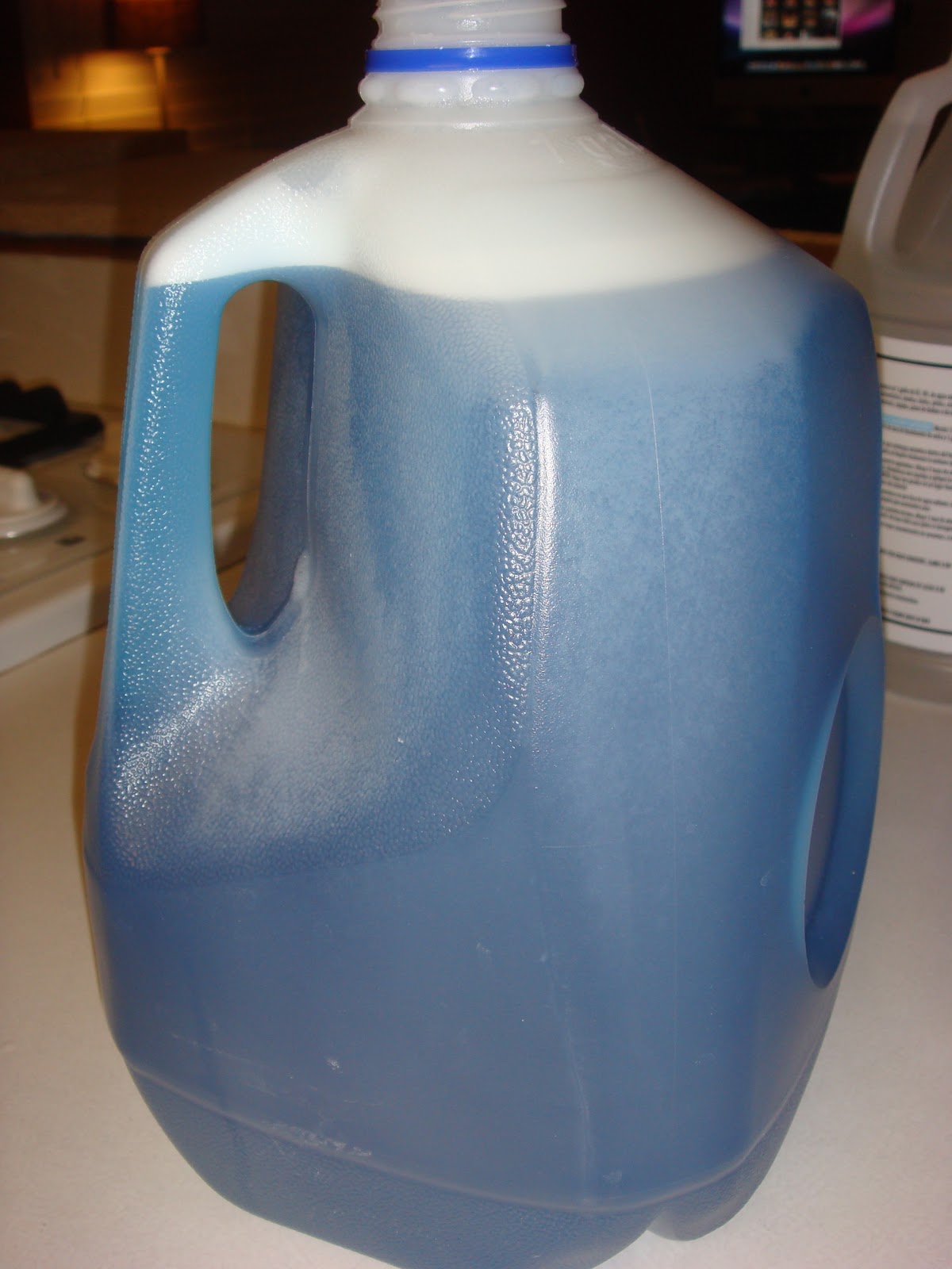 In a gallon jug (we used a rinsed out milk container) pour in all three ingredients.