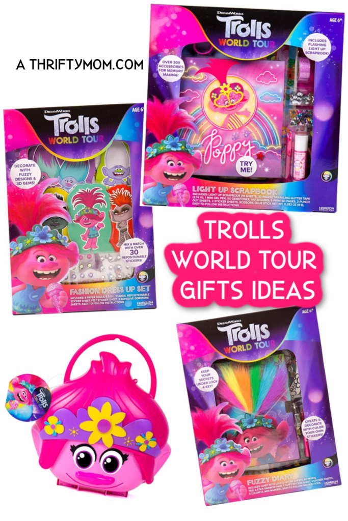 These fun Trolls World Tour Activities make great gifts for Trolls fans. Choose from a scrapbook, diary, dolls, or activity set.